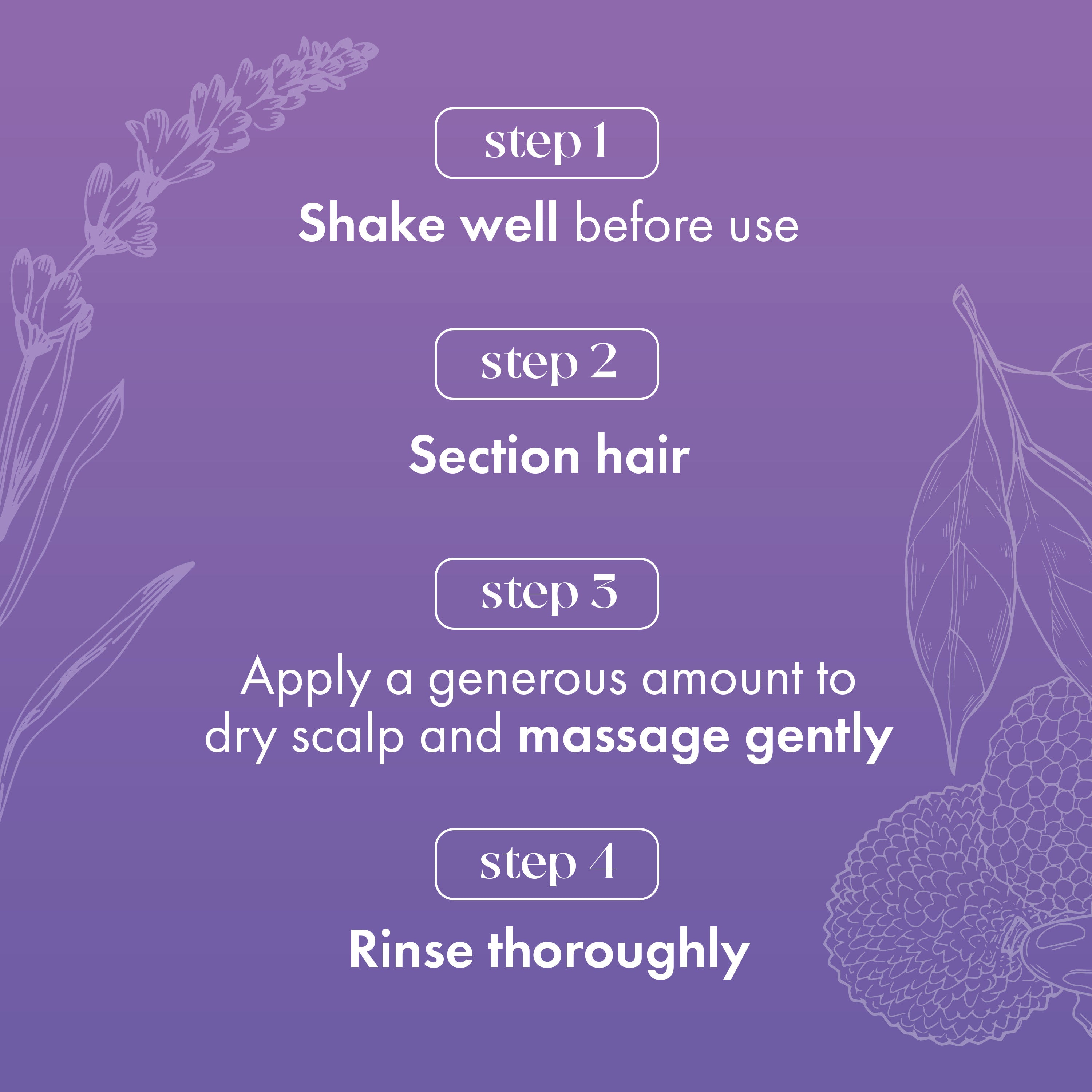 How to Use: Shake well before use. Part hair into sections. Apply a generous amount to dry scalp and massage gently. Repeat to cover the entire scalp. Rinse thoroughly with warm water, then follow with the Lavender & Lychee Scalp Moisturizing Shampoo for best results. Use with every wash for optimal results.